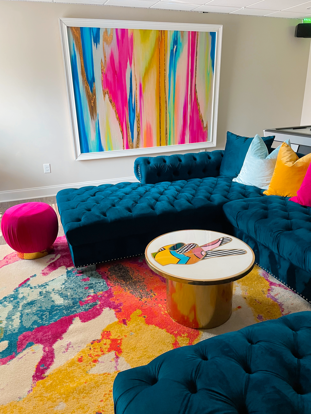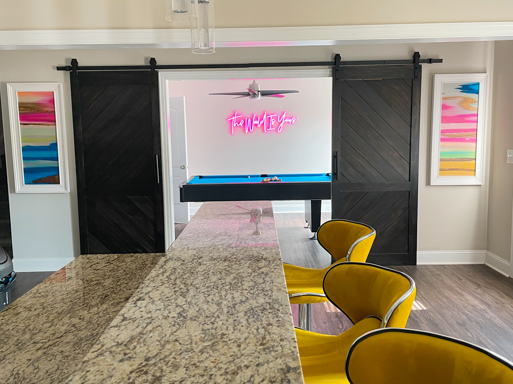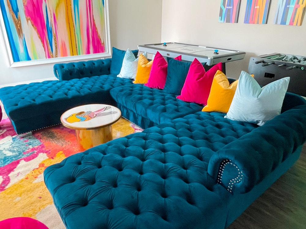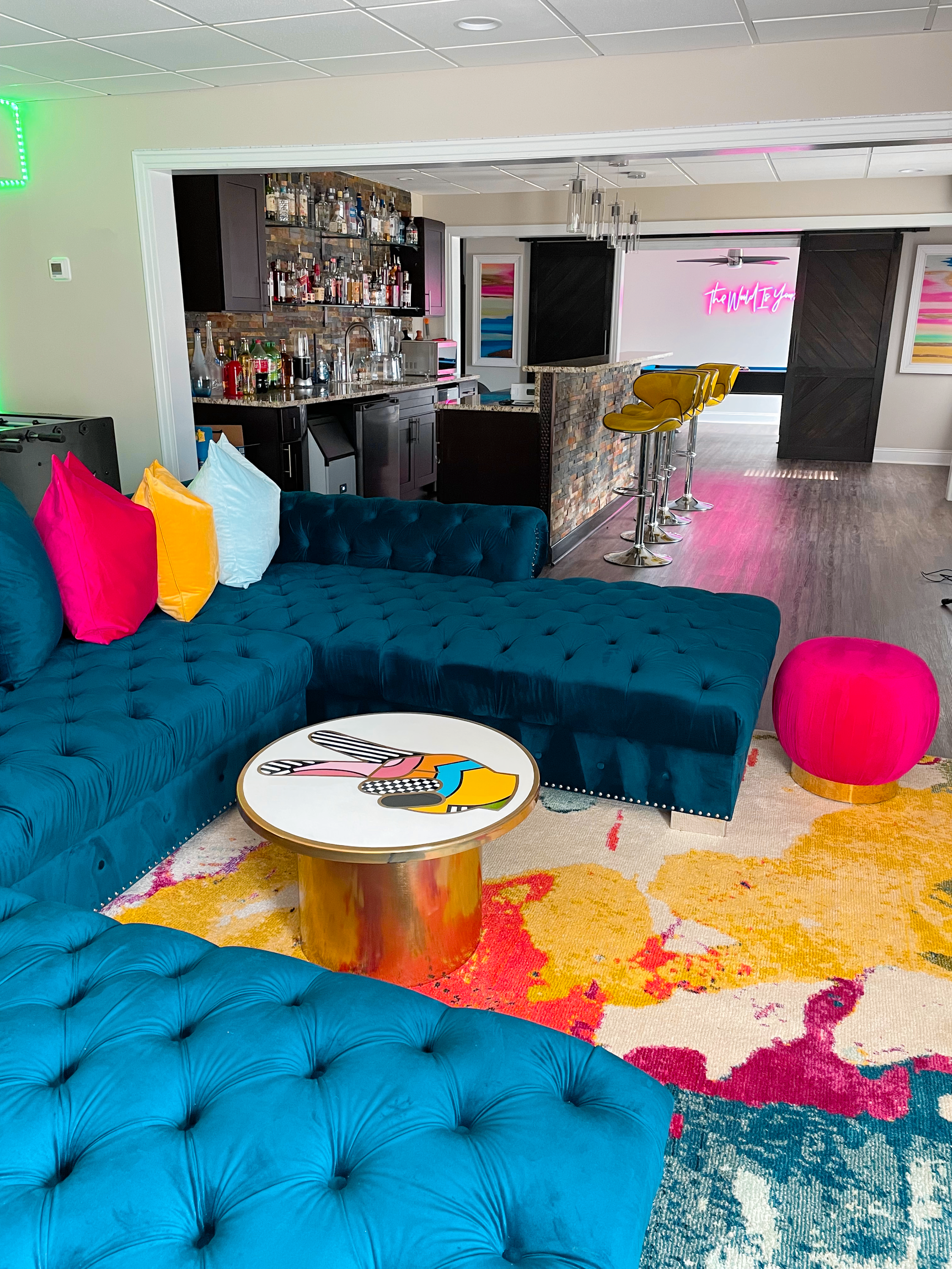 Designed for energy, creativity, and fun, this basement was transformed into the ultimate hangout for Mama & Kenn. A bold color palette of teal, hot pink, yellow, and turquoise brought the space to life, paired with modern textures and sleek finishes. Custom artwork, neon signage, and luxe tufted seating created a dynamic, Instagram-worthy backdrop, while the game tables and bar area kept it functional for endless entertainment. This design perfectly balances playful personality with polished style — ideal for a family making their mark on TikTok.